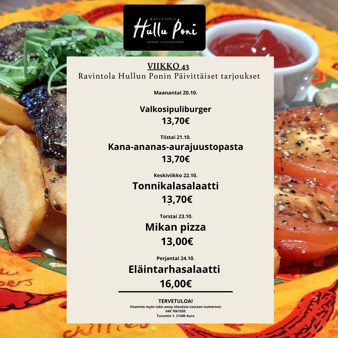Me emme veloita tilavuokraa ja tarvittaessa käytettävissäsi on Auran Hullun Ponin kabinetissa TV-näyttö tai videotykki screenille.